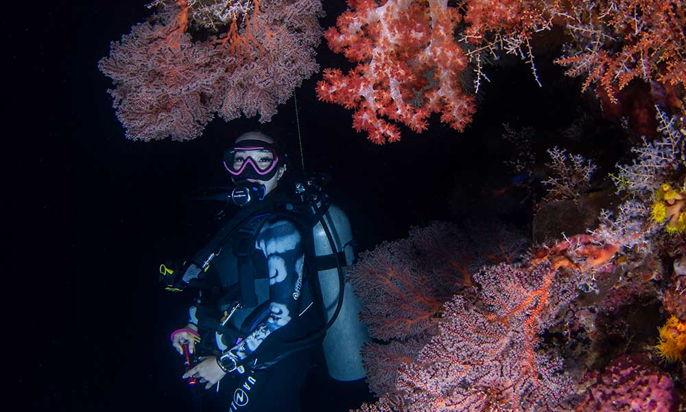 We’ll head to the boat, specifically equipped for comfort, safety, and night diving. Onboard, your guide will give a detailed briefing covering the two dives: what to expect, safety signals for night diving, and how to use your underwater lights.