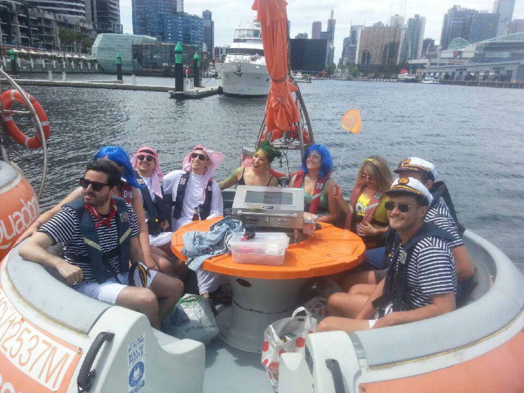 BBQ Boat Melbourne. Perfect for Parties and outdoor cook outs, anniversary, birthdays, team building, xmas parties, or weekend get togethers. Featuring a Gas BBQ, bluetooth sound system located in Docklands, Melbourne. Chill and Grill Aquadonut BBQ boat hire melbourne www.aquadonut.com