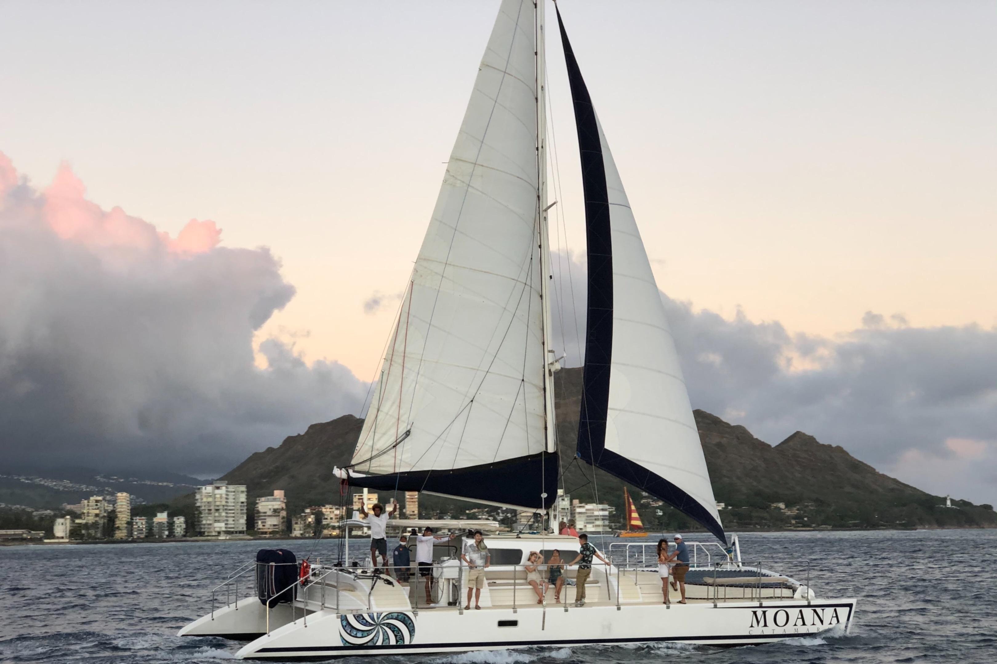 Relaxed catamaran excursions for snorkeling, sunsets, and turtle watching off the coast of Honolulu. Moana Sailing Company offers customizable sailing tours from Kewalo Basin Harbor, with attentive crew, comfortable vessels, and flexible itineraries to suit sunrises, cocktails, and private charters. Guests can snorkel in clear Hawaiian waters, spot sea turtles, and enjoy scenic views of Waikiki from the water. Whether you're seeking a sunset cruise, a daytime snorkeling adventure, or a private voyage, the experience emphasizes safety, comfort, and personalized service aboard a well-appointed sailing catamaran with professional captains.