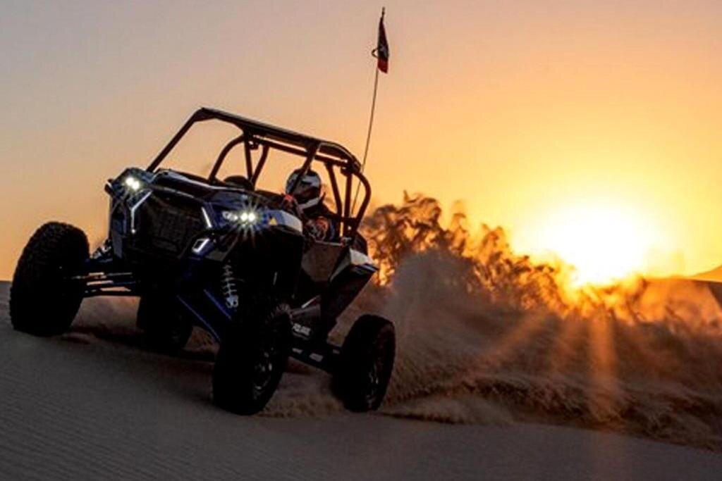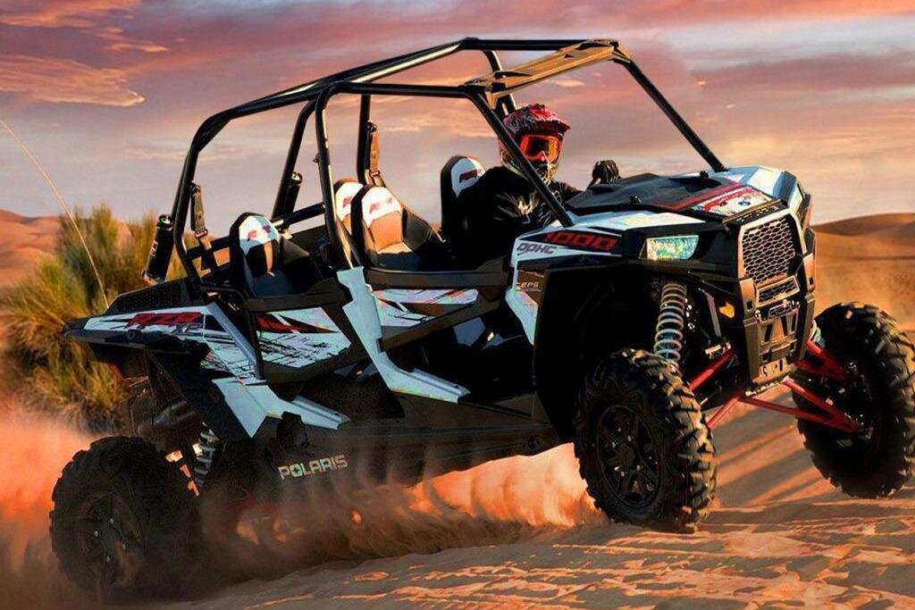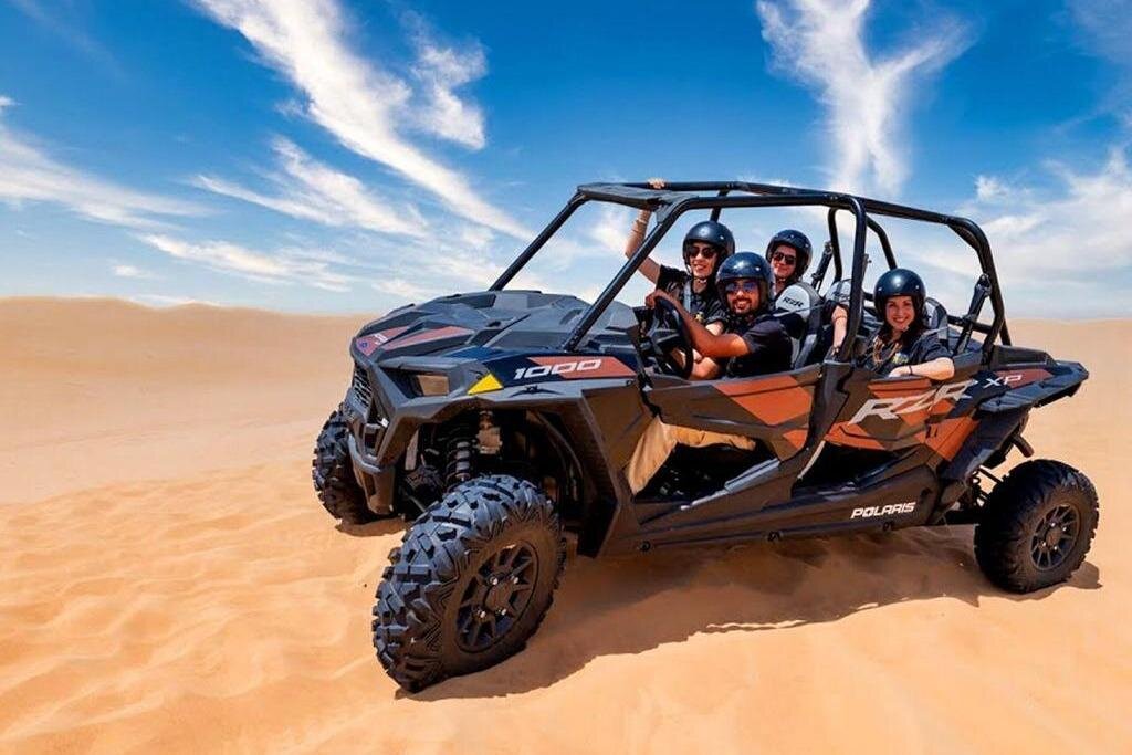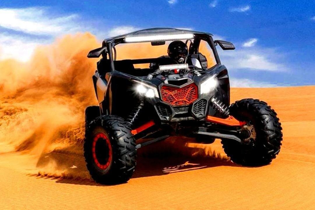 Experience the thrill of self-driving a CAN-AM 04 Seater buggy, camel riding, and sand skiing in Dubai's stunning desert landscape, guided by experts ensuring safety and fun.