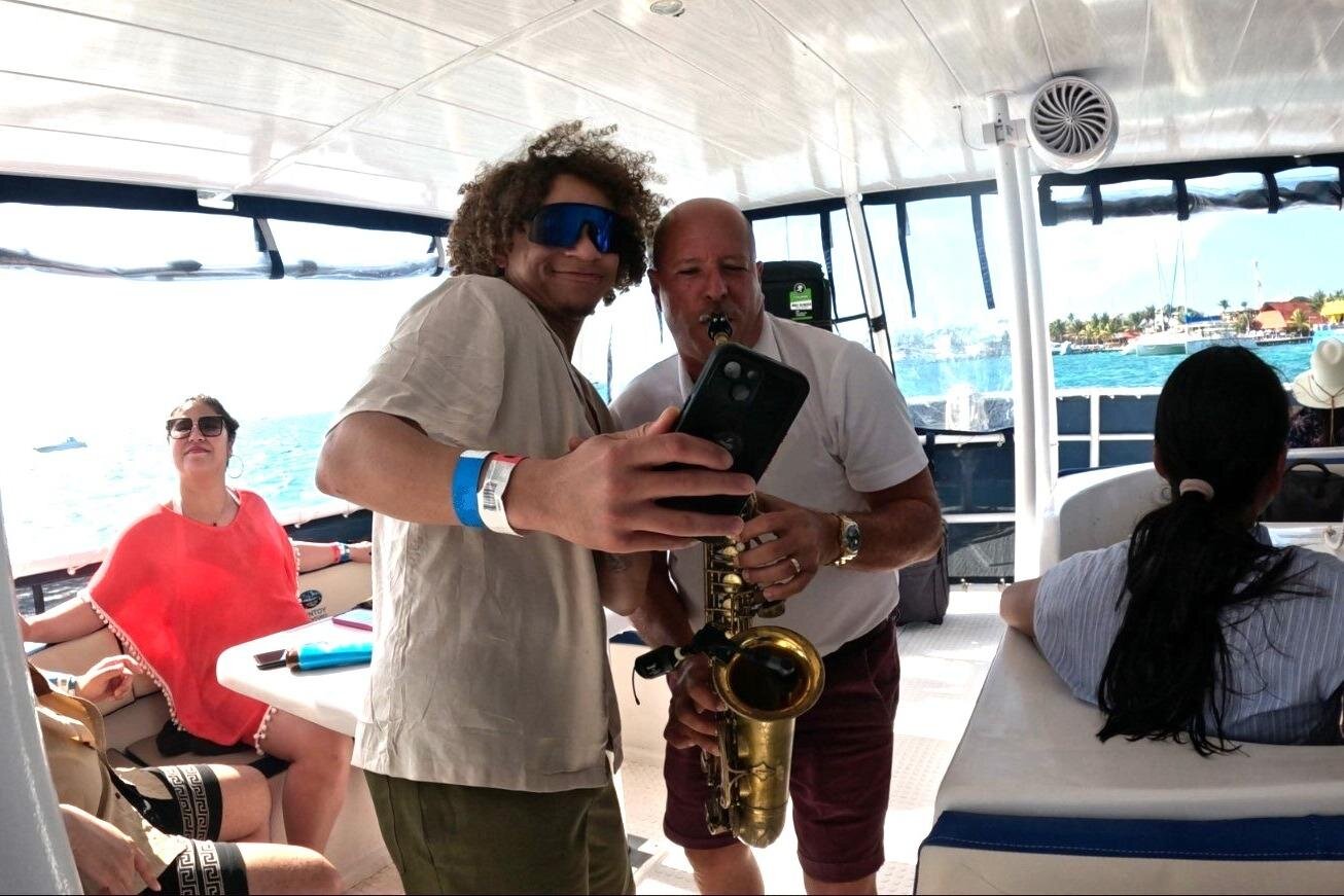 Set sail from Cancun on a luxurious catamaran for a sunset cruise to Isla Mujeres, featuring snorkeling, a buffet dinner, and live saxophone music.