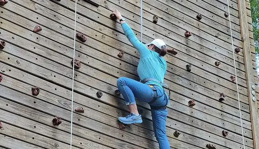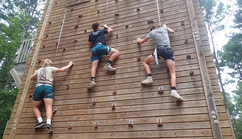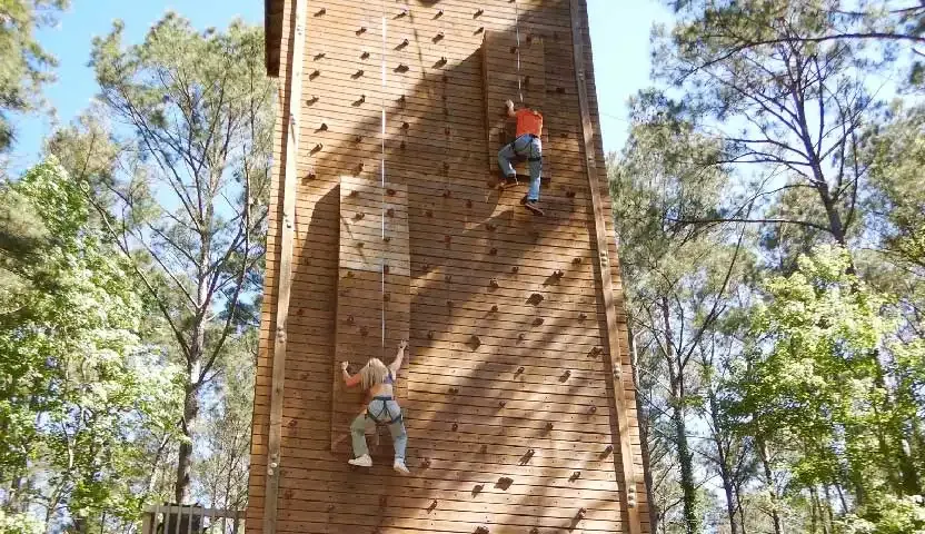 Come CLIMB with us on our outdoor climbing wall! Charleston Adventure Forest is set on 10 acres of forest in Awendaw, South Carolina, just 15 miles from Historic Downtown Charleston. Although we are known for our zipline adventures, we also offer amazing climbs. Our wall is 65 feet tall, so it’s officially the tallest climbing wall in the Lowcountry AND the only one on this side of the Ravenel Bridge. It’s an entirely different experience that’s perfect for those seeking a pure adrenaline rushe specially when tackled after one of our zipline experiences! Additionally, climbing not only produces physical rewards but also challenges you to grow. Your confidence, problem solving, perseverance, determination, and analytical thinking are all stretched as you venture up our climbing wall. In order to ensure everyone has the opportunity to benefit from this experience, the wall has been designed to have three different sections varying in difficulty. This allows several individuals to climb simultaneously, and it is the perfect adventure for both beginners and advanced climbers!