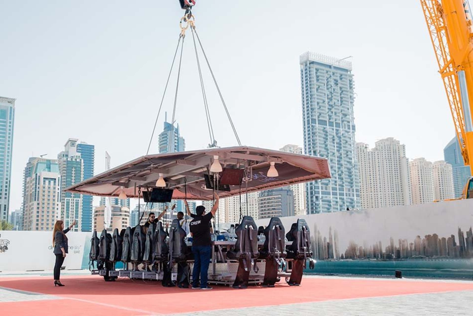 Take to the Sky Once you make your way to its location at Skydive Dubai (Al Sufouh), strap yourself to the seat before you are gently lifted to a height of about 50 meters by a crane. Recline in your comfy chair and see your feet dangling in the air as you look around for the most unhindered city skyline views. The table and the seats gently spins during this splendid 90 minutes dining experience means it lets you to take in Burj Al Arab, Burj Khalifa, Palm Jumeirah and Dubai Marina like never before.