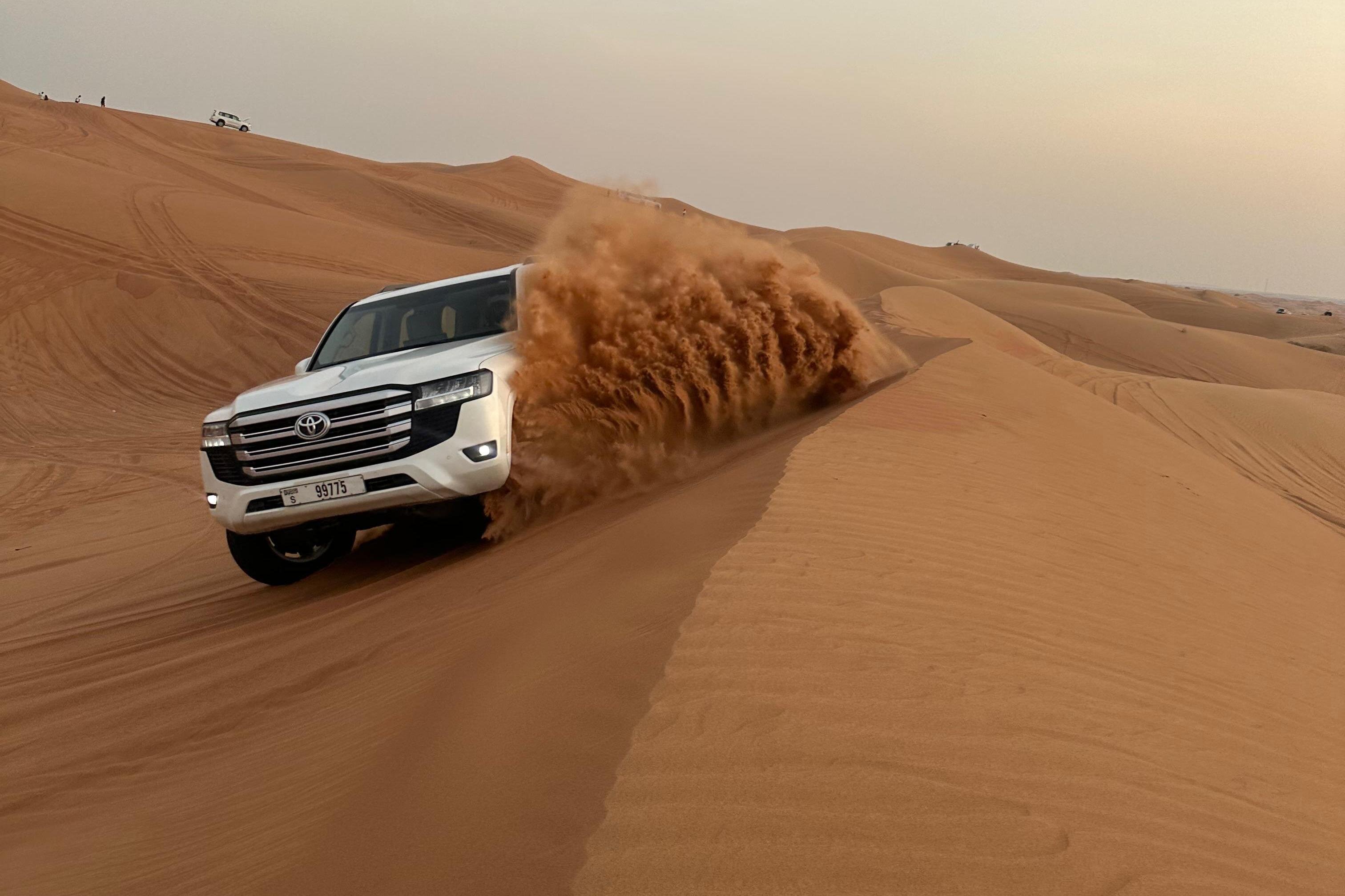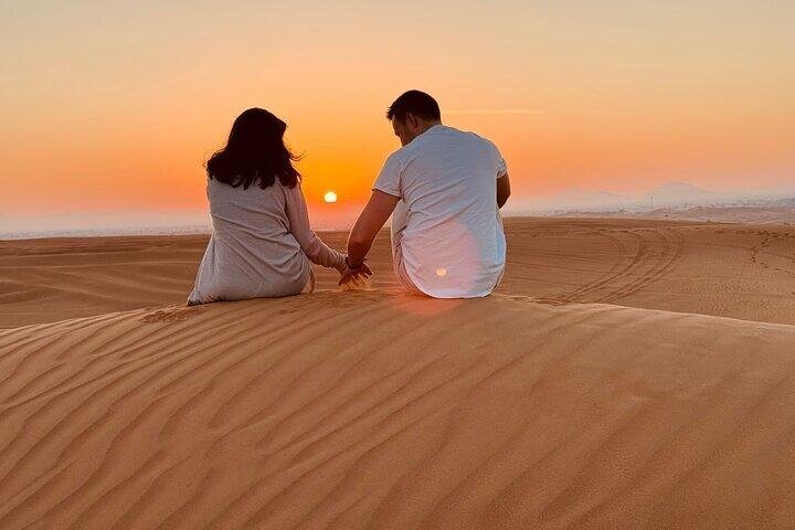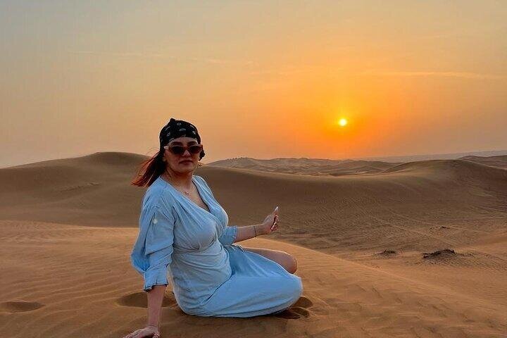 Immerse yourself in the enchanting Dubai desert on this unforgettable evening adventure. Begin with a serene camel ride across the golden sands, offering a unique perspective of the vast desert landscape. As the sun sets, indulge in a traditional BBQ dinner under the stars, savoring a variety of delicious dishes. The night comes alive with vibrant live entertainment, including mesmerizing belly dancing and exhilarating fire shows, providing an authentic taste of Arabian culture. This experience promises a perfect blend of adventure, cuisine, and entertainment, making it a must-do for visitors seeking the essence of Dubai's desert allure.