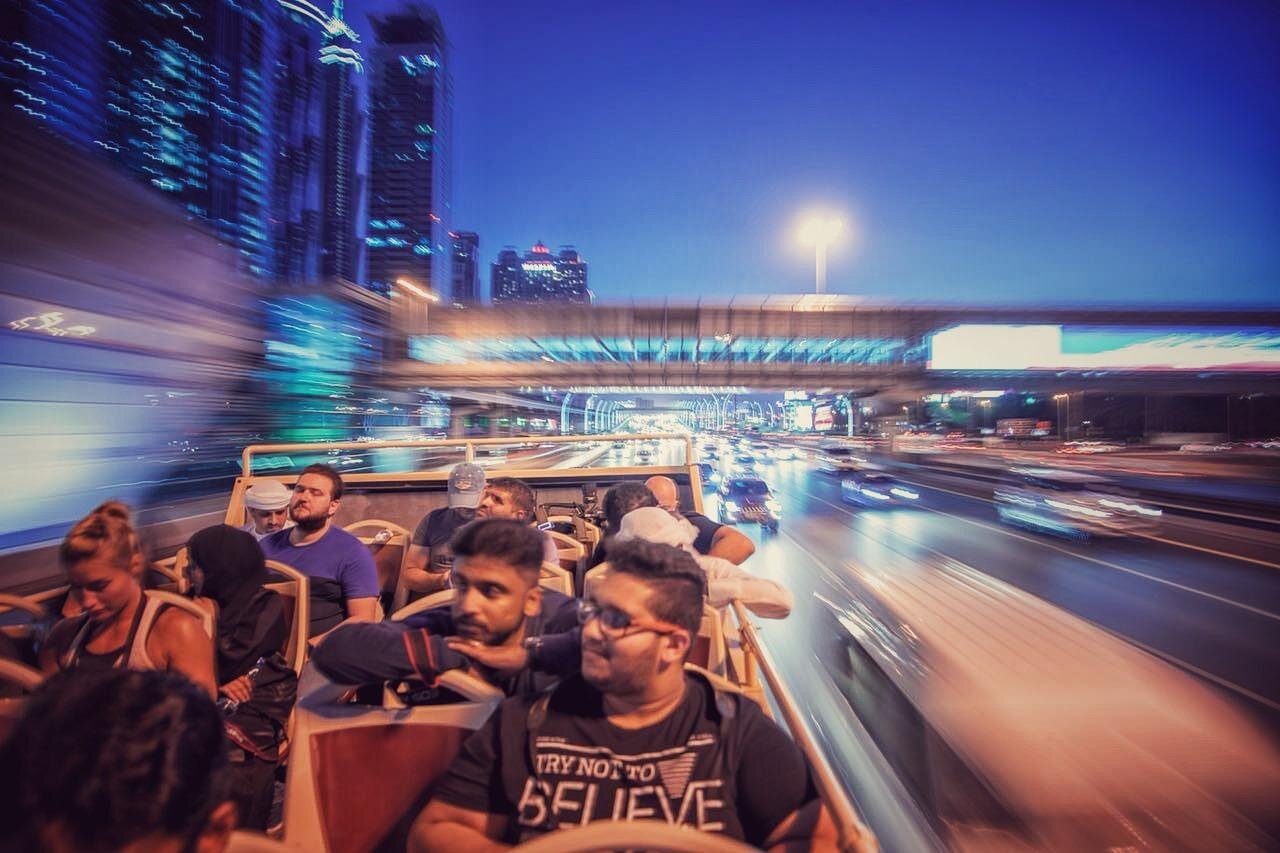 Experience Dubai's dazzling nightscape on an open-top bus tour, featuring iconic landmarks and vibrant city lights.