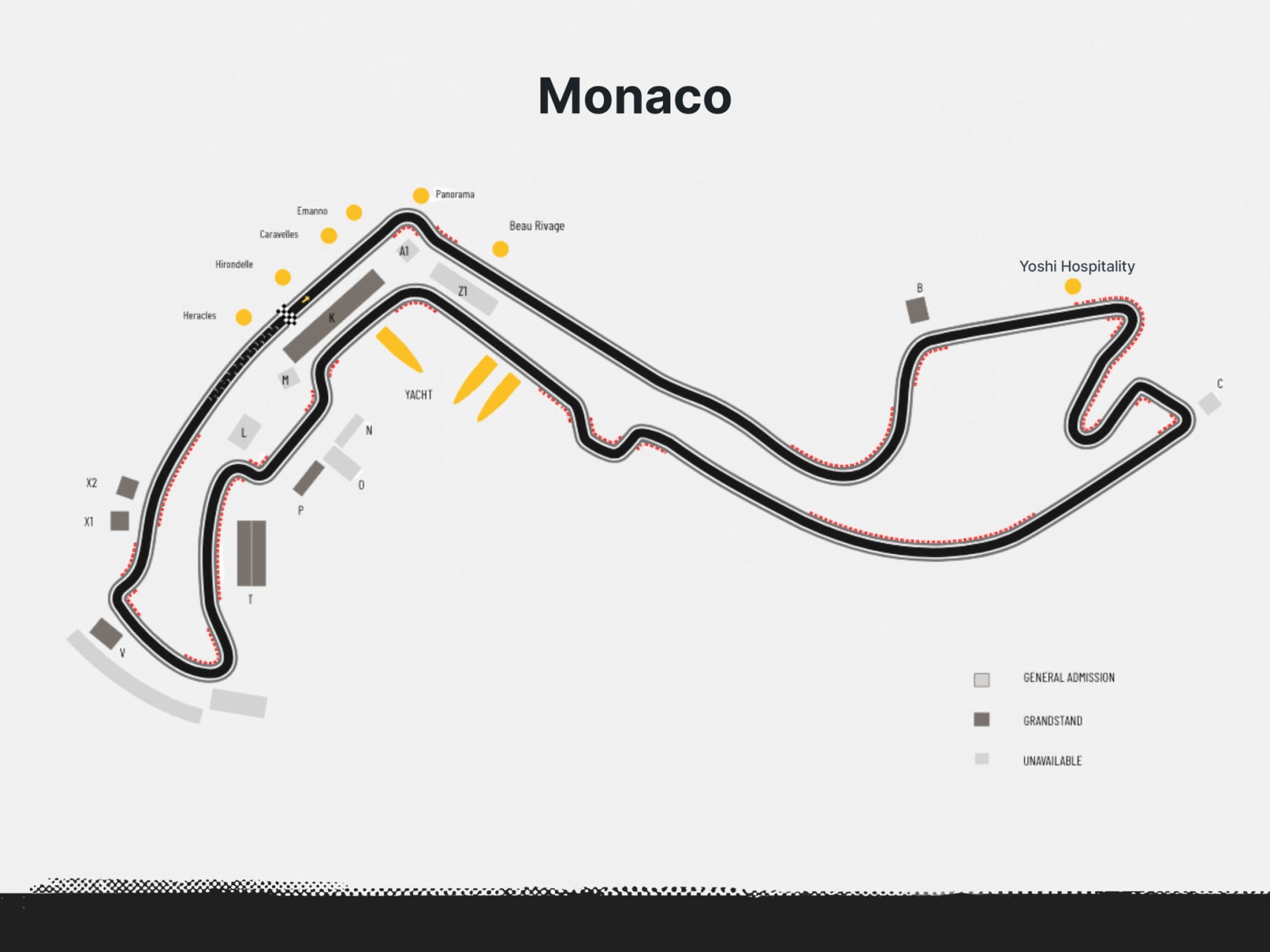 Grandstand K: SATURDAY AND SUNDAY PASS. Grandstand K stretches from Tabac to the Piscine chicane section, and tickets for the Upper section guarantee a great overview of this part of the circuit, as well as a view up to the Tunnel exit chicane. Spectators will also enjoy a pleasant panorama of the harbour section and the Mediterranean.