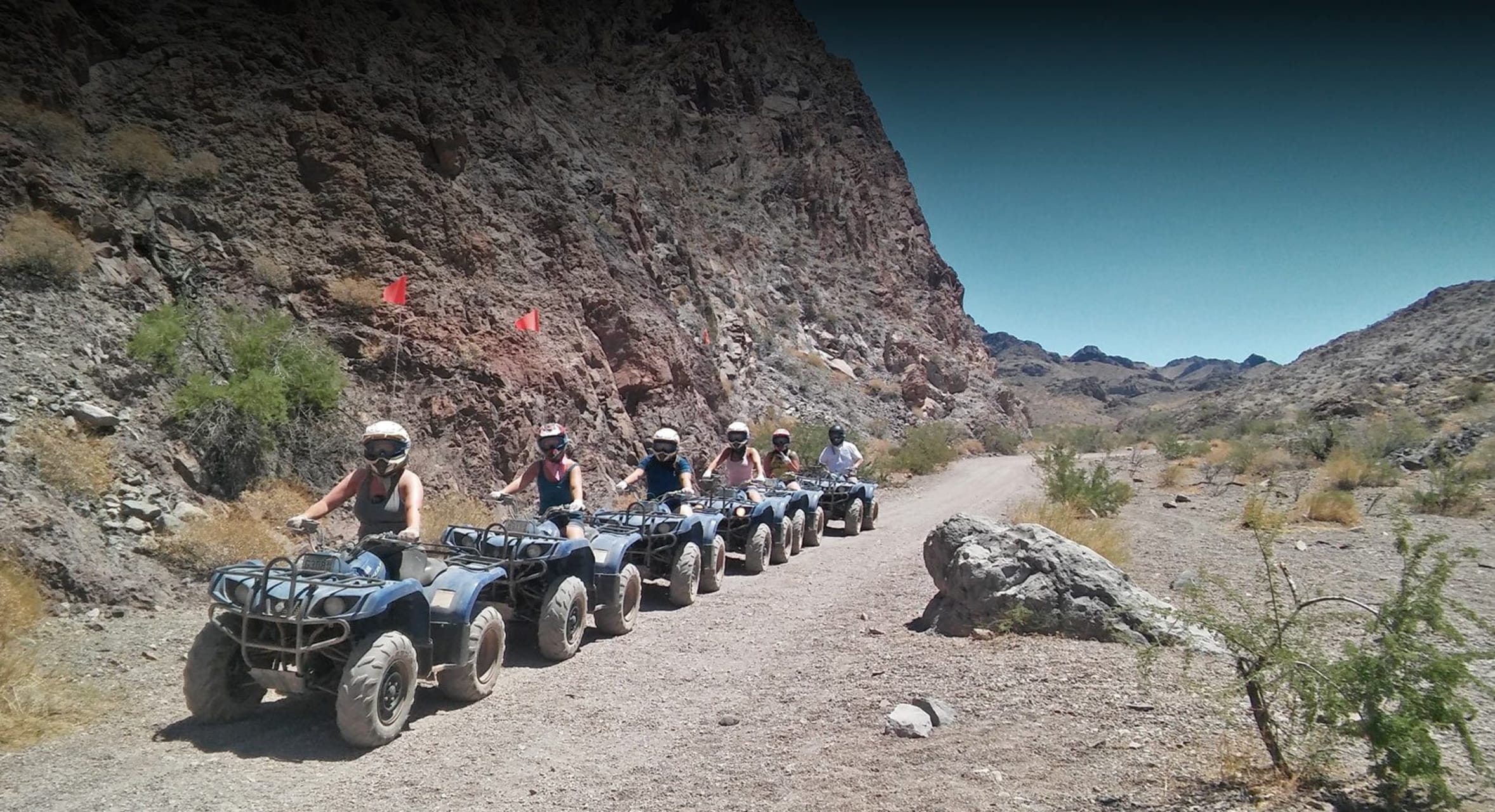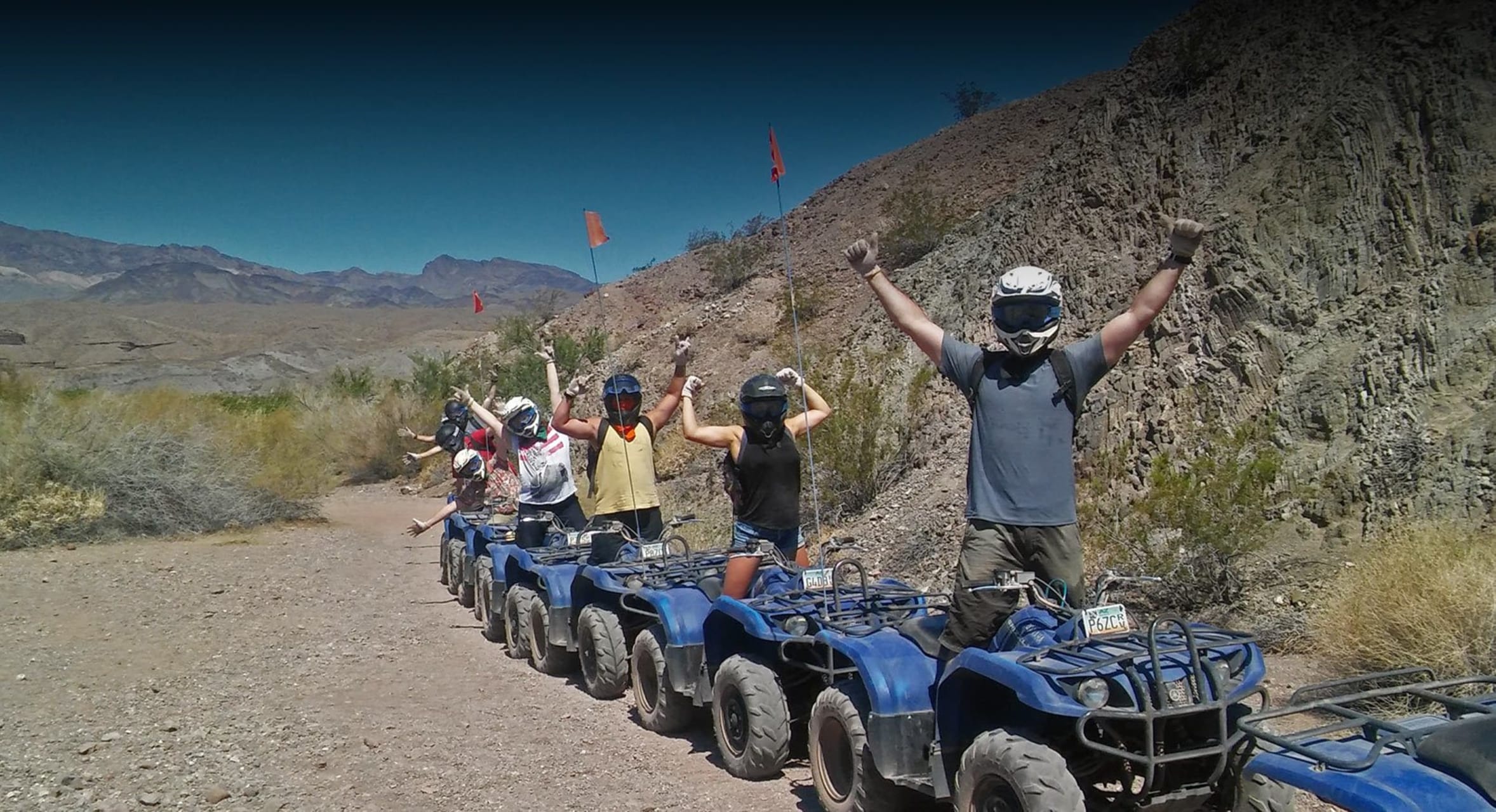 COLORADO RIVER: We offer the only beautiful motorized scenic tour through the trails at Lake Mead National Park to the Colorado river. Once our adventure arrives at the halfway point, we stop at the Colorado River for a photo and video opportunity and a splash in the water in the summer months. Next, we jump back on the atv trail and go to our onsite restaurant for our world famous burger, fresh cut fries, and soda. On the way back to your hotel we will stop at the Hoover Dam Bridge for a 15 minute photo and video opportunity. MOJAVE DESERT: Ride through the sandy Mojave Desert terrain for 1 hour and 30 minutes a you enjoy the picturesque mountain views. Our trail is an exclusive private trail not open to other companies or the general public.