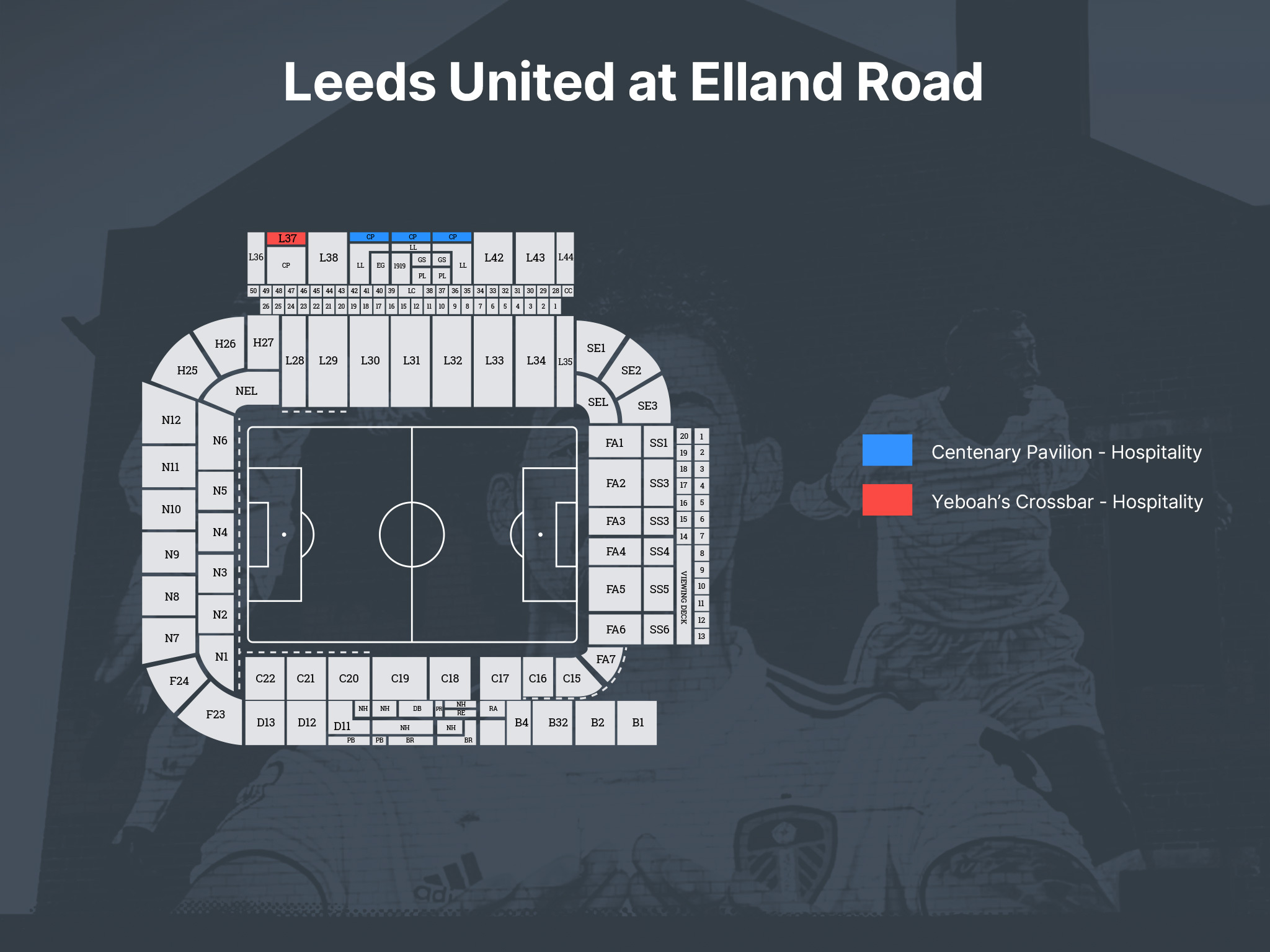 Yeboah’s Crossbar - Hospitality: Yeboah’s Crossbar Hospitality at Elland Road offers an informal matchday experience with official seating in the East Upper on the goal line, delivering an excellent pre-match atmosphere. Located next to the Pavilion facility opposite the East Stand, the lounge opens two hours before kick-off and remains accessible until one hour after the final whistle, with half-time stadium concourse access included. Guests receive a food and drink voucher on arrival, freshly brewed tea and coffee before kick-off, plus an official matchday programme and team sheet. The experience is completed with pre-match analysis from a Matchday Host and a Leeds United Legend.