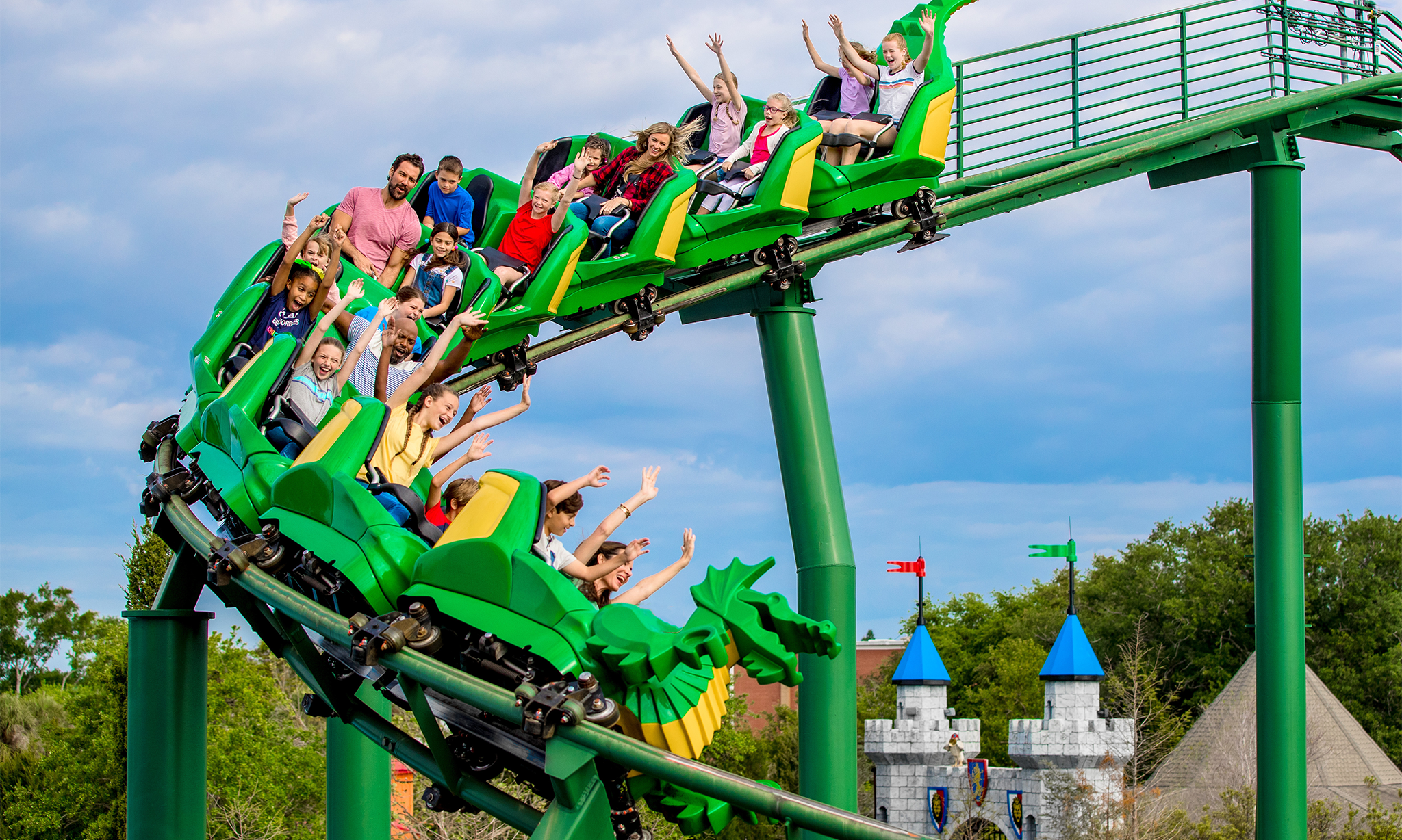 Step into an imaginary world of knights and princesses to conquer the Dragon Coaster. Looking for something more contemporary? See a life-sized LEGO Ferrari F40 and fine-tune your very own LEGO Ferrari car to race at one of three racetracks.
