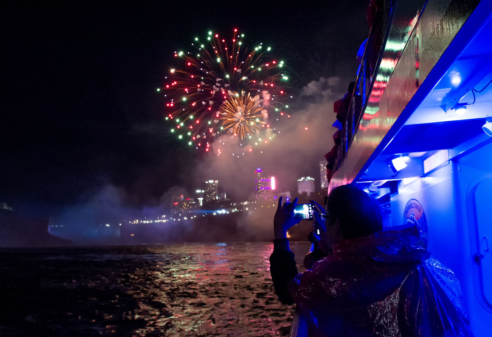 From the water, enjoy panoramic views of the illuminated Canadian Horseshoe Falls and American Falls. As the boat positions near the falls, the fireworks begin overhead, providing a front-row vantage point that cannot be experienced from shore.