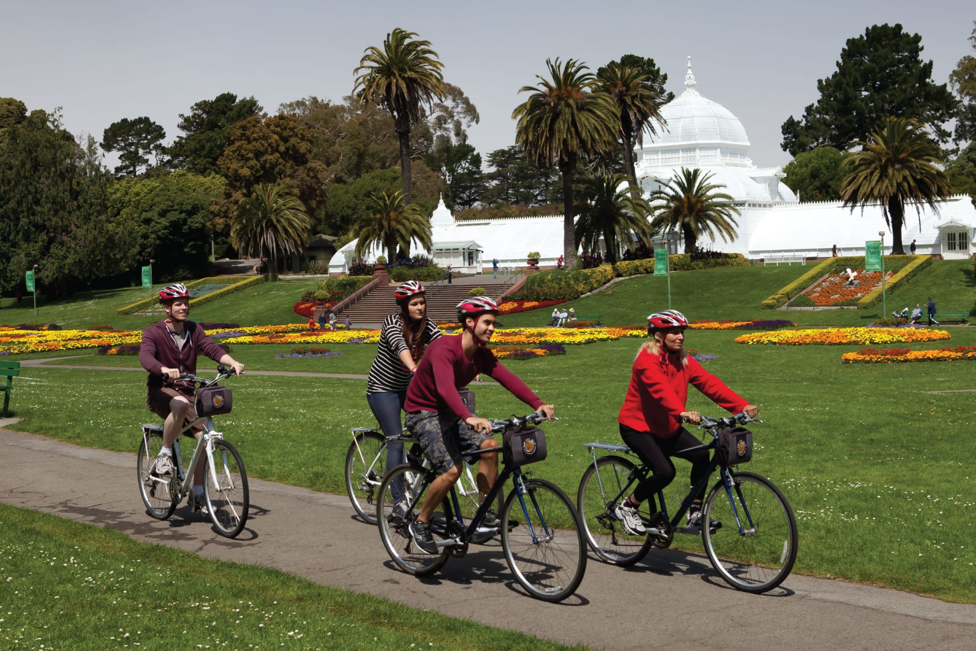 1 Day Bike Rental Once you hop off the bus, you can explore San Francisco by bike for a full day. Ride along the Marina District, passing Crissy Field beaches with its stunning views of the Golden Gate Bridge, and stop by the Palace of Fine Arts. Cut an easy ride through Golden Gate Park to see the bison up close and to get a glimpse of the multi-million-dollar California Academy of Sciences, or ride across the 1.7-mile span of the world-famous Golden Gate Bridge with spectacular views of San Francisco and Alcatraz Island. Ride down to Sausalito for a picnic by the waterfront, and return by ferry (not included).