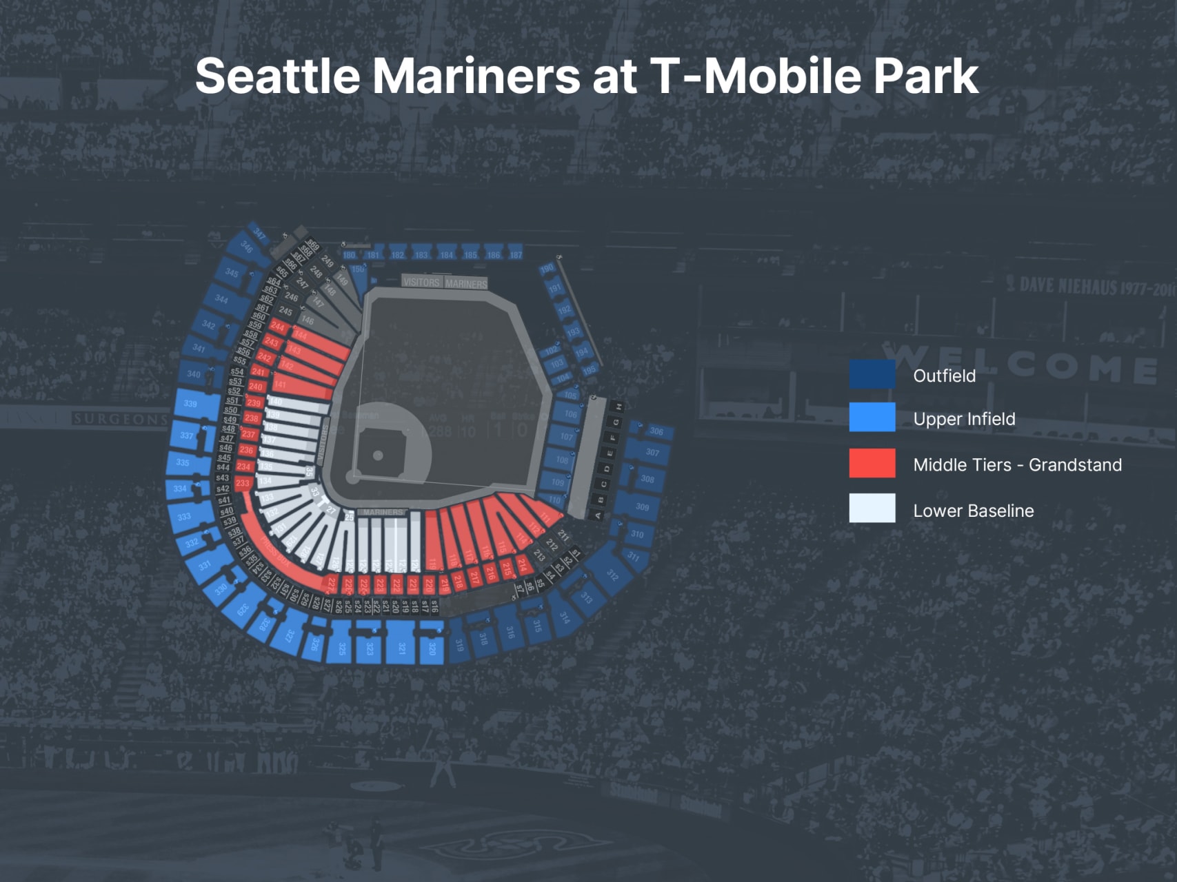 Middle Tiers - Grandstand: Located in the Middle Tiers Grandstand seating along the 3rd baseline, behind home base or along the first base line.