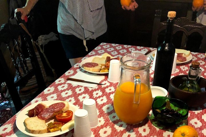 The trip finishes in Soller town with a lunch based on the traditional "pa amb oli", Mallorcan rustic bread with tomatoes, olive oil, jam, cheese an olives. Wine, water, a freshly squeezed orange juice and a dessert called Gató, an almond cake very popular of the island.