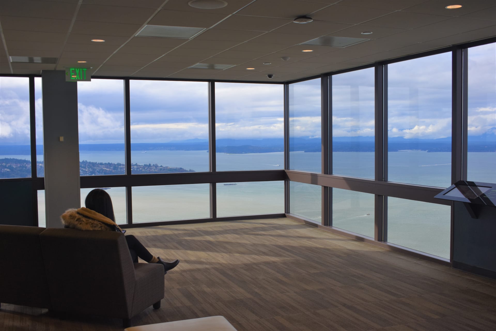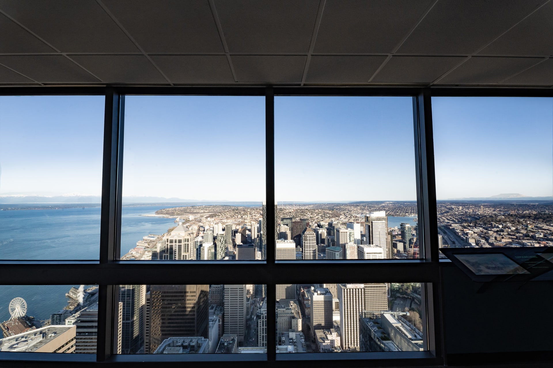 Sky View Observatory is located on the 73rd floor of Columbia Center. At 902 feet it offers the tallest public viewing area in the Pacific Northwest. The 360 degree panoramic view includes Mt. Rainier, Bellevue, the Cascade Mountains, Mt. Baker, Elliott Bay, the Olympic Mountains, the Space Needle and the city of Seattle.