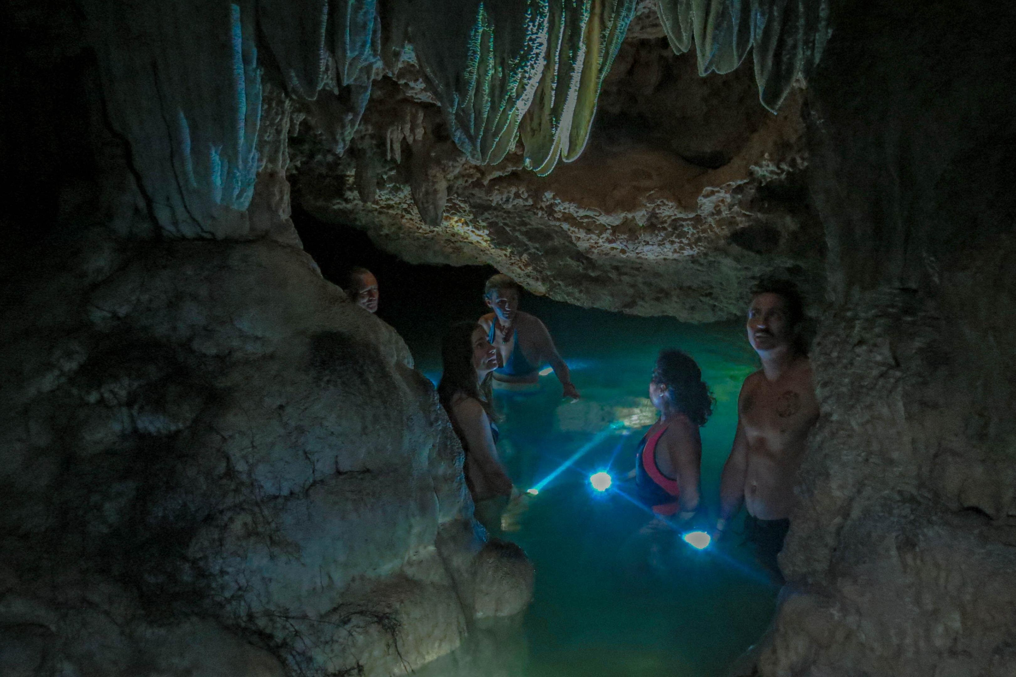 Dive into Tulum's hidden cenotes on a guided adventure, swimming in crystal-clear waters and exploring unique stalactite formations.